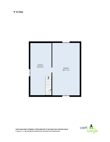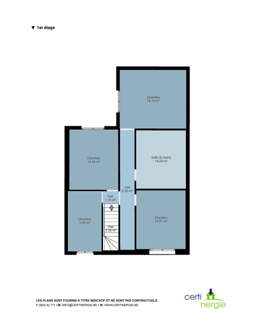 Au 1er étage, vous trouverez un hall de nuit de +/- 8m² qui distribue 4 chambres (19 m²-14,46 m²-14,28 m² et 14,21m²) une salle de bain de 14,28m² et l’accès au grenier se fait par un escalier fixe en béton de +/- 67,11 m².