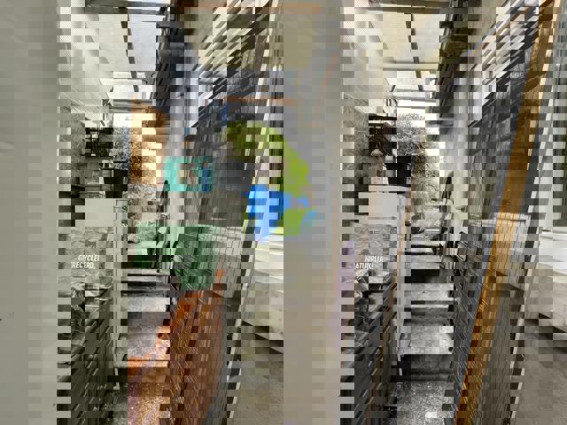 - Rez-de-chaussée : Hall d'entrée, living (+/- 15 m²), salle à manger (+/- 12 m²), cuisine équipée (+/- 14 m²) avec accès jardin (+/- 40 m²), salle de douche