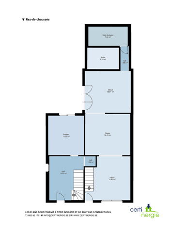 Au rez-de-chaussée, un hall d’entrée de 14m², le coin salon de 18m², la salle à manger de 18m², un coin bureau (ou autre) de 14m², le coin cuisine de +/- 19m², un débarras de 6 m² et une salle de bain de 7m². Un jardin de +/- 600 m².