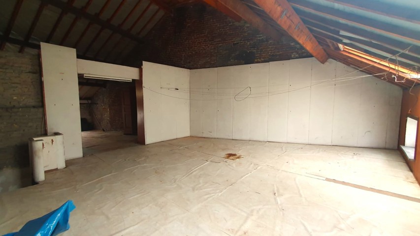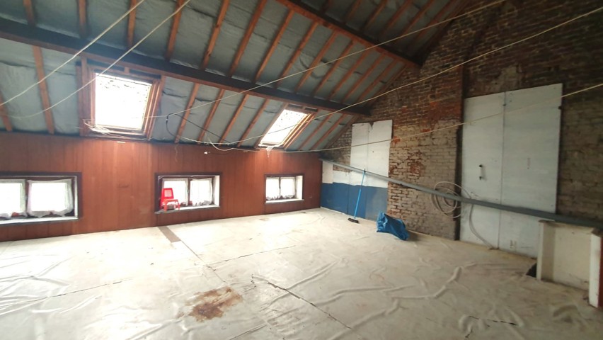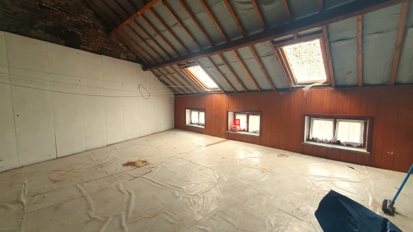 Etage : hall de nuit - distribue 2 chambres (+/-18 et 25 m²), une salle de bain (+/-10m²) (accessible par une des chambres) et l’accès à un grenier très spacieux par un escalier fixe (+/- 69m²) aménageable en 2 pièces supplémentaire.