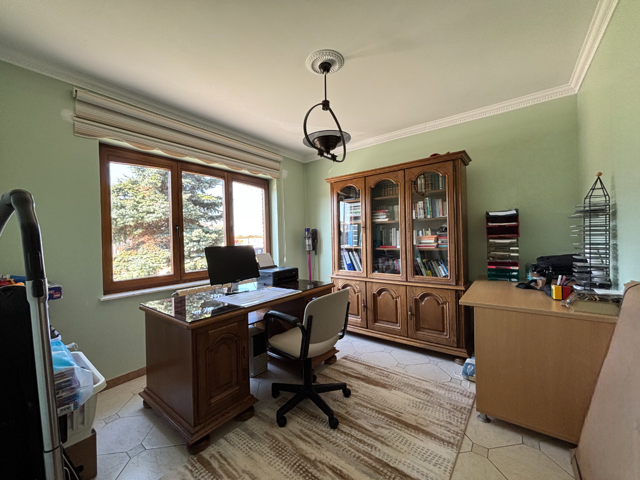Elle se compose comme suit, hall d’entrée de +/- 10m² distribue un bureau +/-11m², w.c. séparé, une belle salle de bain de +/- 7m², un grand salon très spacieux avec salle à manger de +/- 40m² suivit de la cuisine équipé +/-21m² qui mène à la terrasse avec une partie véranda de +/-15m² et une partie ouverte donnant vue sur le jardin arboré d'environ 220 m² ainsi qu’une vue dégagée sur prairie et le jardin avant de +/- 170 m²