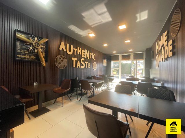 En corps principal : un restaurant comprenant un bar à boisson (+-15m2), une cuisine full équipée (+-25m2) donnant vue sur la grande salle (+-75m2). Dans le fond, vous pourrez y trouver un bureau (+-12m2), une remise ainsi que des W.C. H/F. Système technique : PAC air chaud/froid.