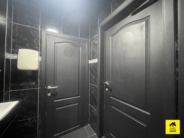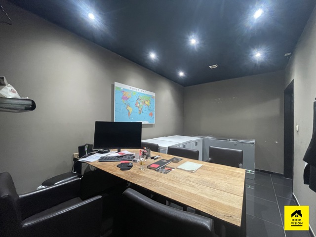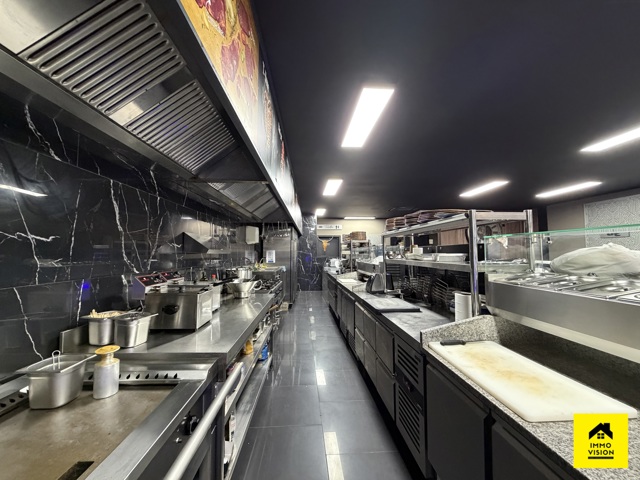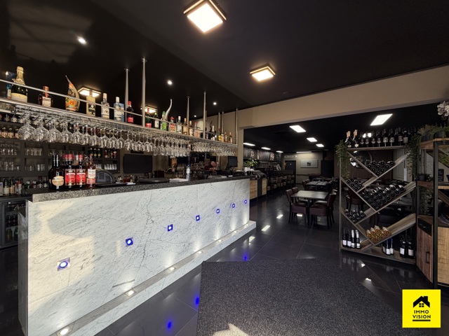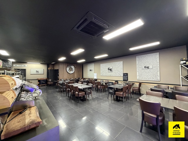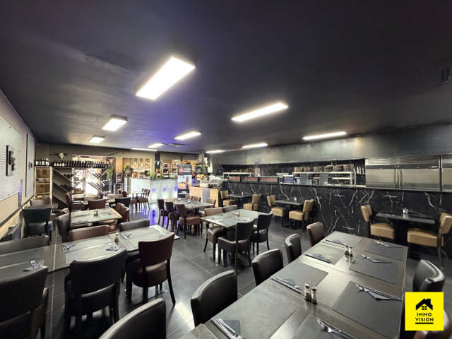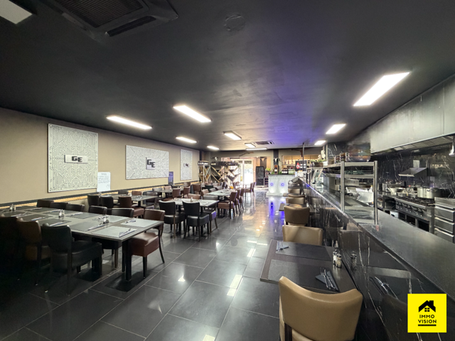 En corps principal : un restaurant comprenant un bar à boisson (+-15m2), une cuisine full équipée (+-25m2) donnant vue sur la grande salle (+-75m2). Dans le fond, vous pourrez y trouver un bureau (+-12m2), une remise ainsi que des W.C. H/F. Système technique : PAC air chaud/froid.